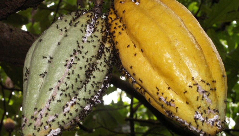 Worldwide, cocoa farmers struggle against severe but geographically limited pest infestations. Ants, which form part of the complex network of life in cocoa farms, are often seen as pests.