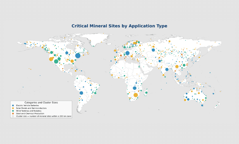 . Global clusters of critical mineral deposits and sites, derived from USGS geospatial point data on mines, deposits, districts, and mineral regions (2017). The map identifies areas where multiple deposits occur within a 500-kilometre radius and illustrates the spatial distribution of minerals essential for key technologies: electric vehicle batteries (lithium, cobalt, manganese, graphite, tin); solar panels and semiconductors (gallium, germanium, indium, tellurium, platinum-group elements); wind turbines and robotics (rare-earth elements, niobium, tantalum, titanium, zirconium, hafnium, vanadium, beryllium, rhenium); and steel and chemical production (fluorite, barite, antimony). Image credit: UNU-INWEH