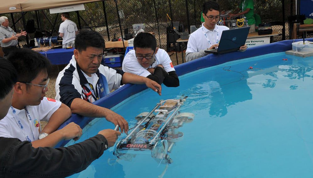 Students from China’s Harbin Engineering University perform in-water checks on their autonomous underwater vehicle (AUV). Image credit: Rick Naystatt/U.S. Navy (Public domain). This image has been cropped.