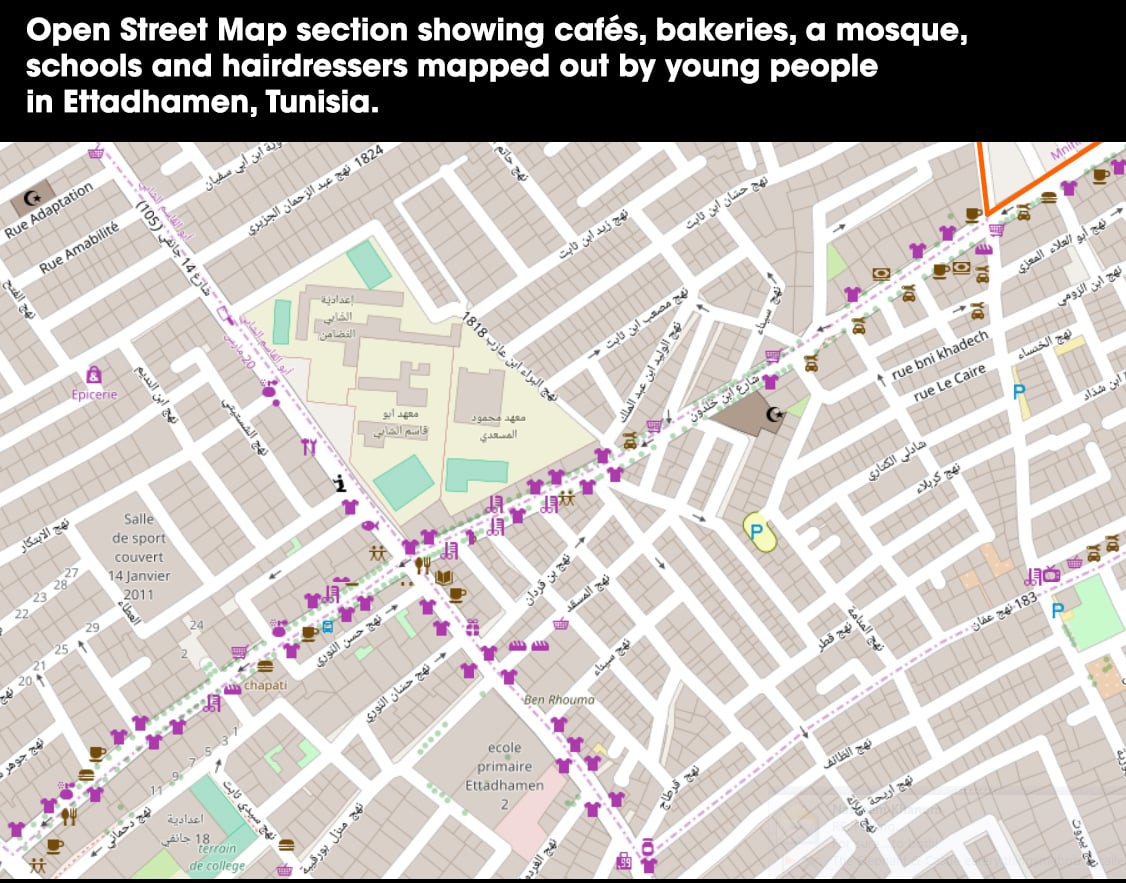 In the Tunisia project, the idea to use Open Street Map came from the young people. It was important to be guided by their particular sense of place: Without jobs, their surroundings bonded them together — and yet that same neighbourhood marked them out. Young men told us how at job interviews, they were too embarrassed to admit to coming from Ettadhamen.