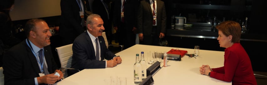 Scotland’s First Minister Nicola Sturgeon meeting the Prime Minister of Palestine Dr. Mohammad Shtayyeh during COP26. Copyright: Scottish Government, (CC BY 2.0).